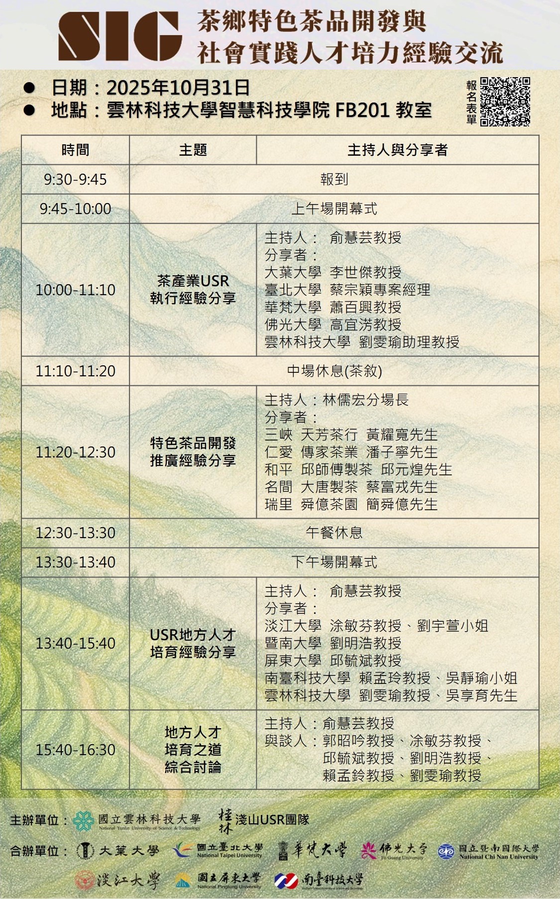 二、本次「SIG茶鄉特色茶品開發與社會實踐人才培力交流」活動,聚焦特色茶品開發、茶產業USR推動經驗與社會實踐人才培育等主題,誠摯邀請貴校師生踴躍報名參與。