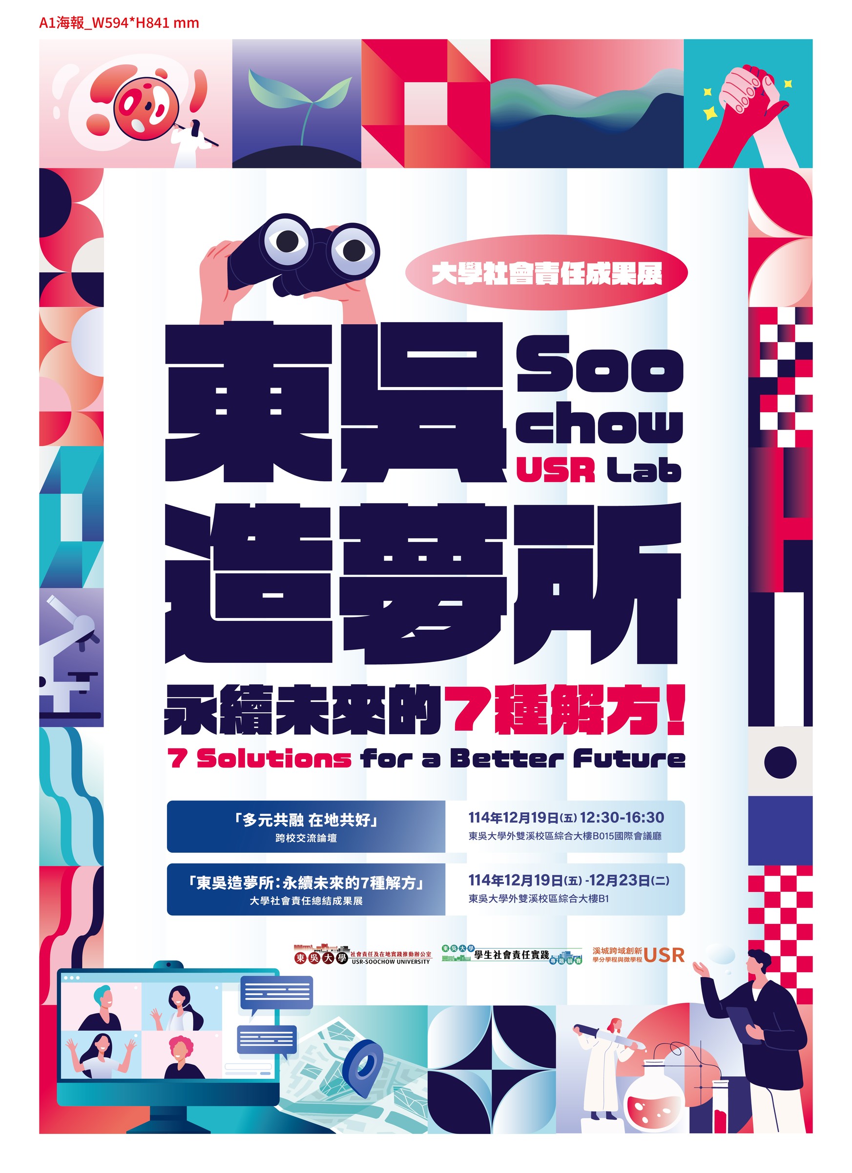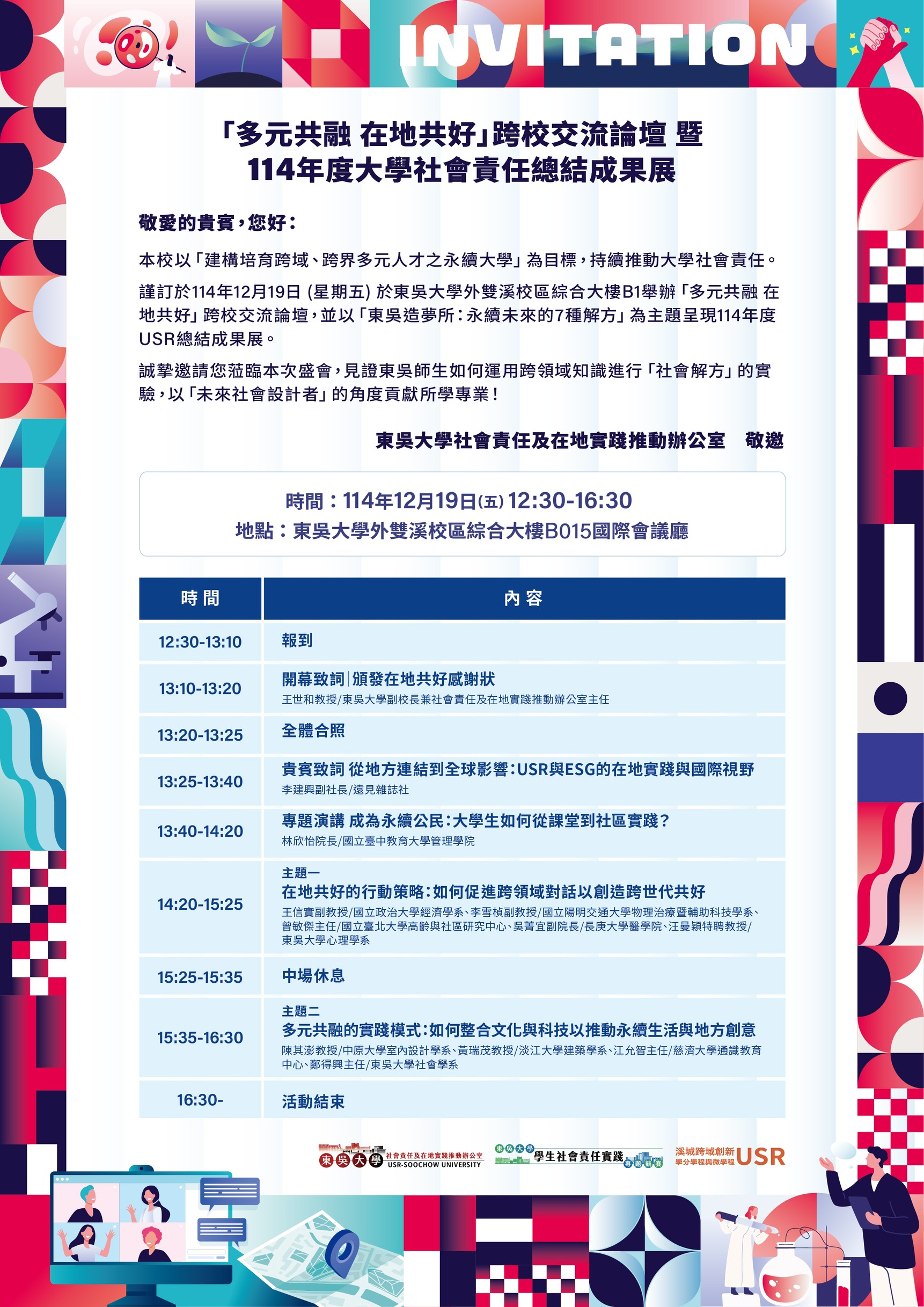 主旨:東吳大學於114年12月19日(星期五)舉辦「多元共融 在地共好」跨校交流論壇暨大學社會責任總結成果展,敬邀師長及同仁踴躍參加。