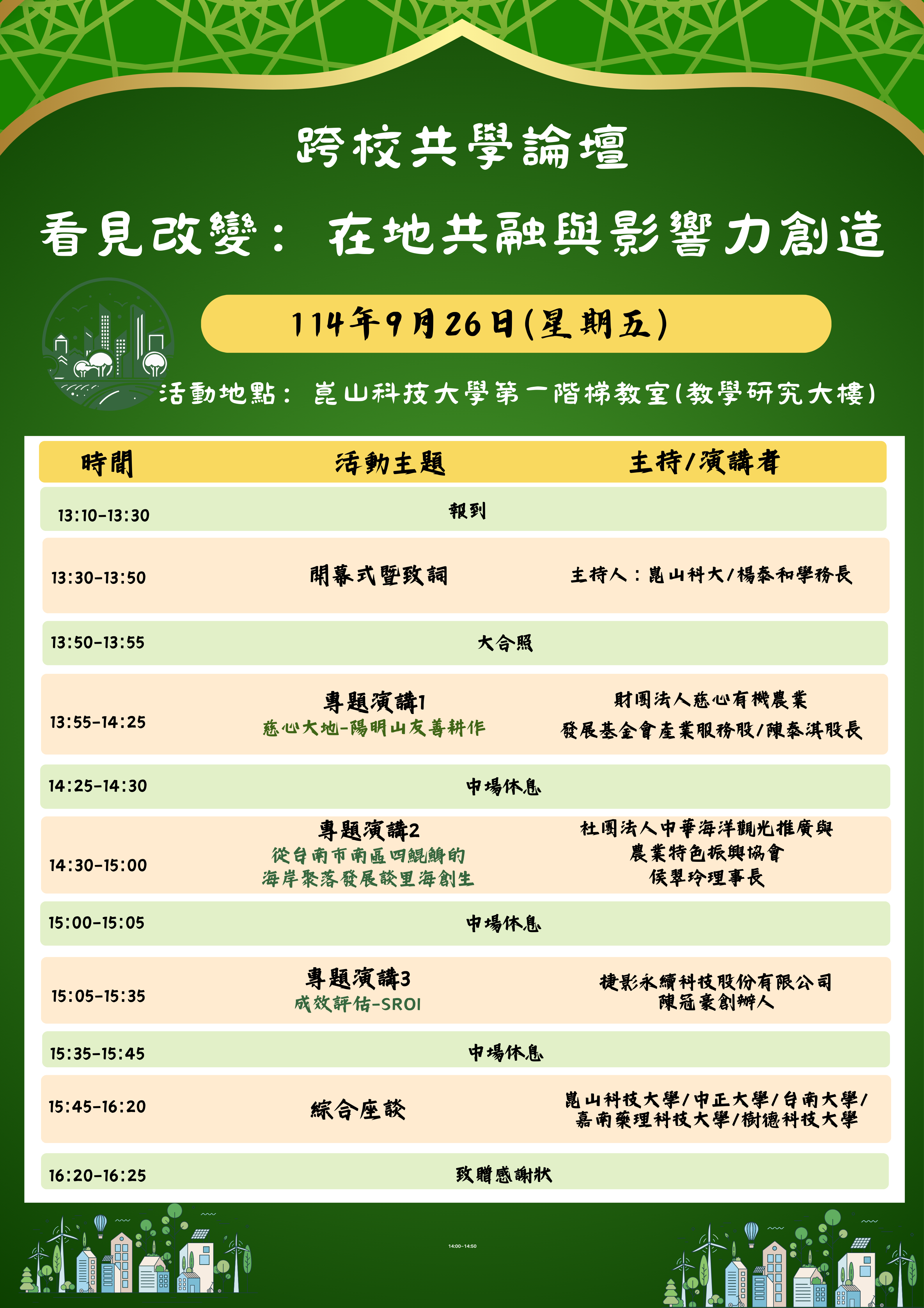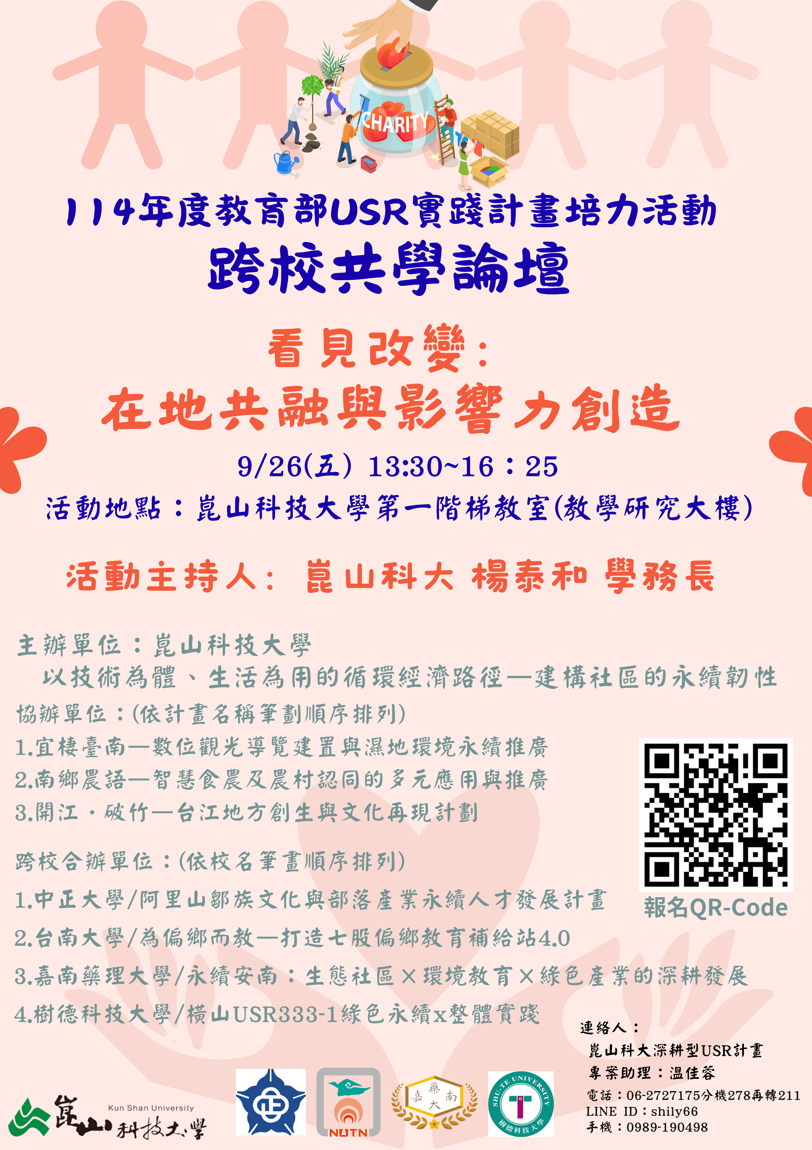 本校大學特色類深耕型USR計畫《以技術為體、生活為用的循環經濟路徑—建構社區的永續韌性》與中正大學、台南大學、嘉南藥理大學、樹德科技大學(依校名筆劃順序排列),共同辦理跨校共學論壇-看見改變:在地共融與影響力創造,敬邀各團隊夥伴及師生共同參與。